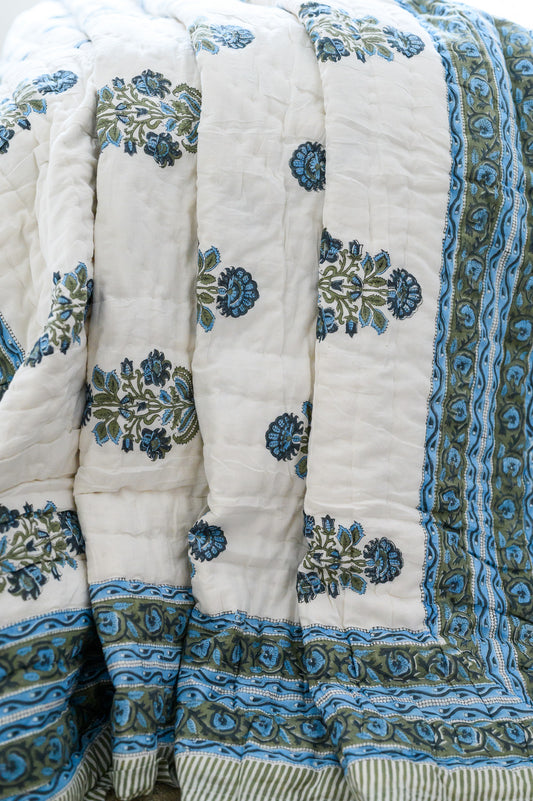 BLUE BLOSSOM BLOCK PRINT COTTON QUILT