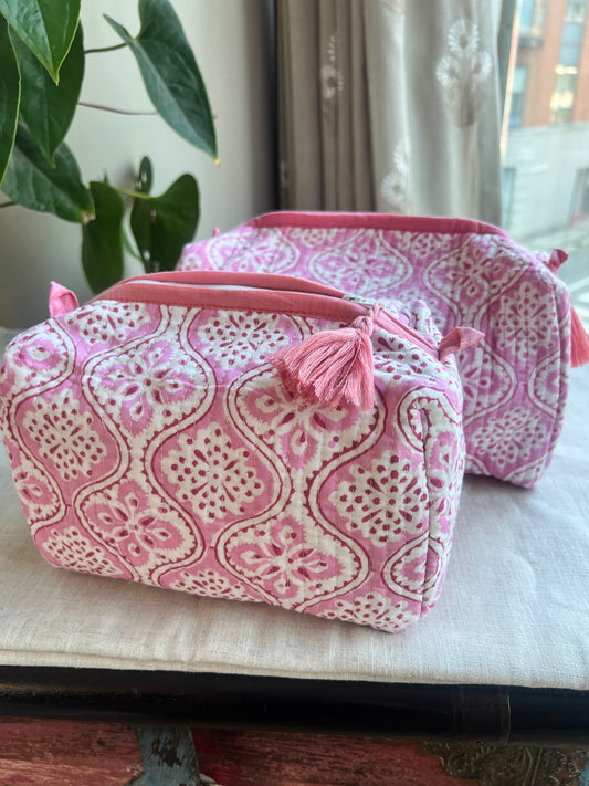 QUILTED COTTON BLOCK PRINT WASH BAG - PINK OGEE