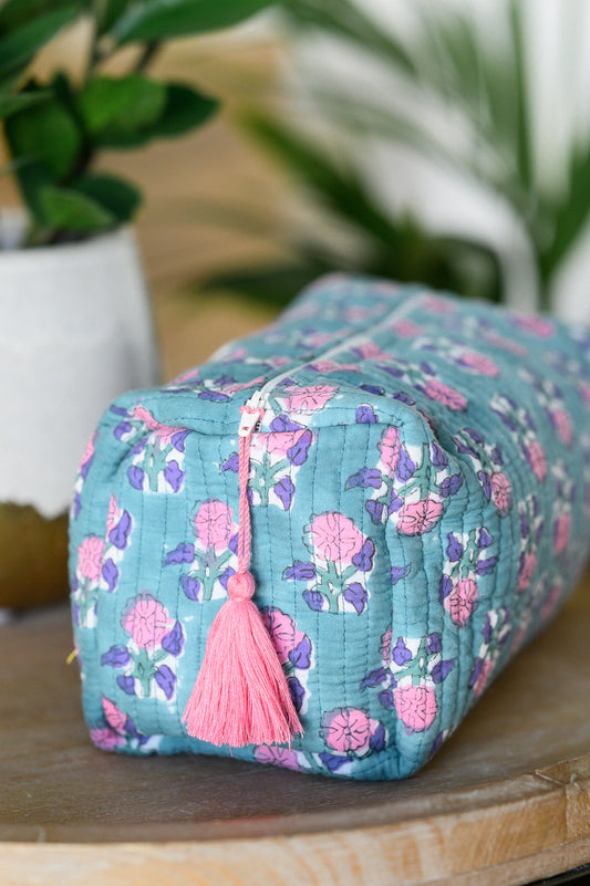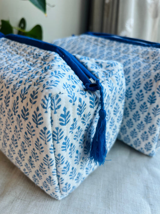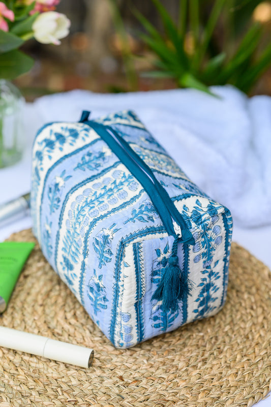 QUILTED COTTON BLOCK PRINT WASH BAG - BLUE BOOTI
