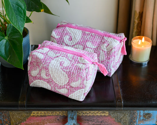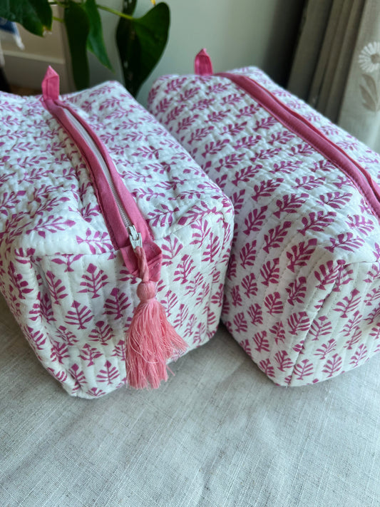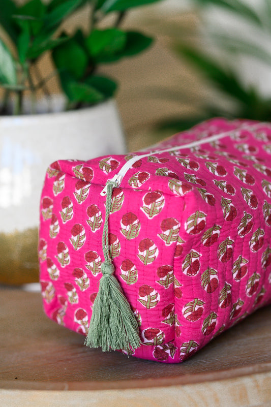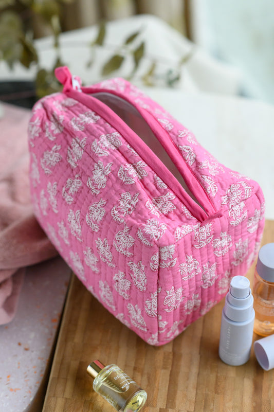QUILTED COTTON BLOCK PRINT WASH BAG - PINK BOOTI