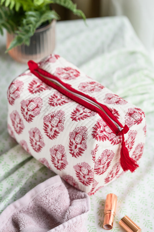 QUILTED COTTON BLOCK PRINT WASH BAG - GULMOHAR RED