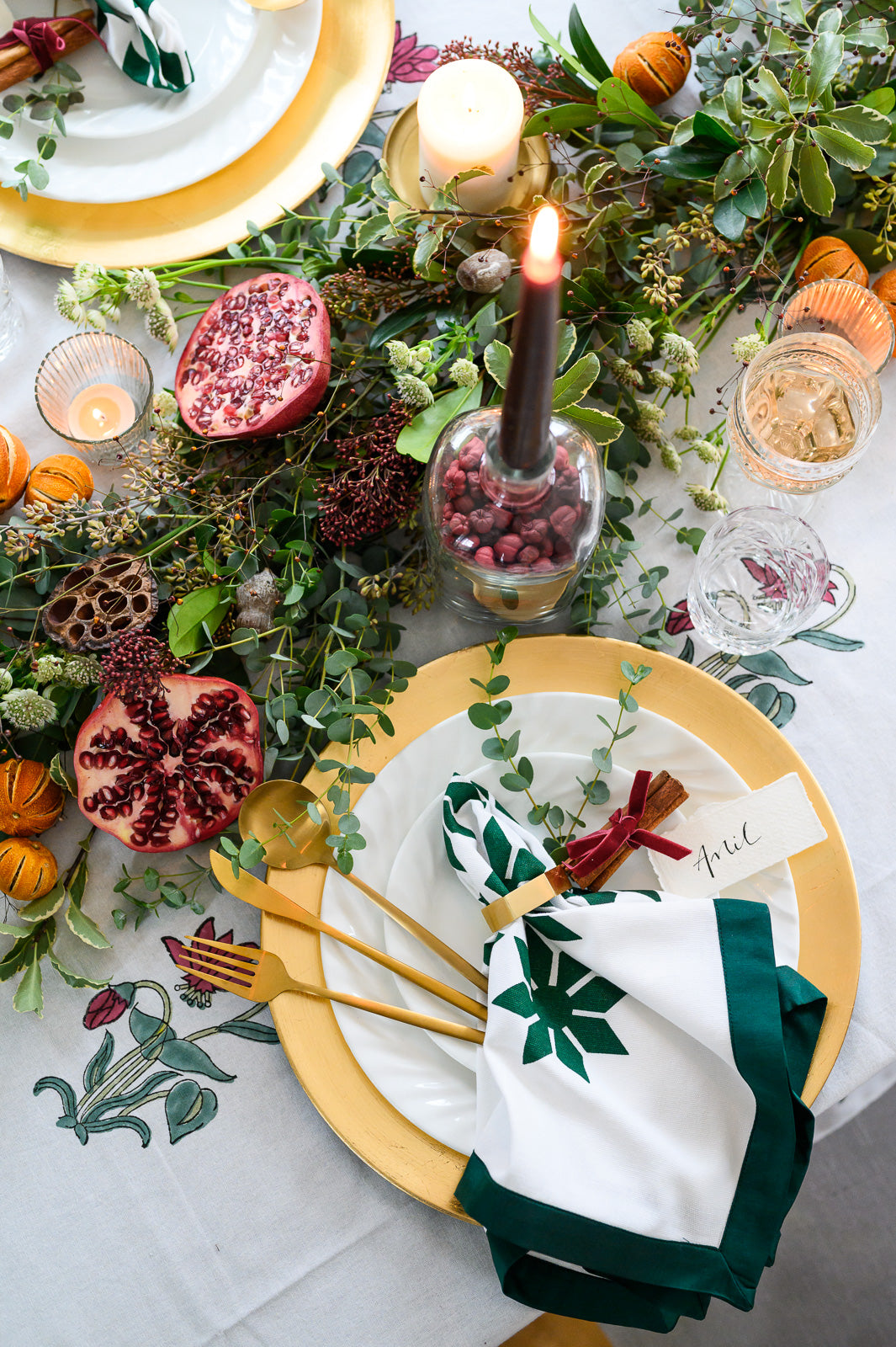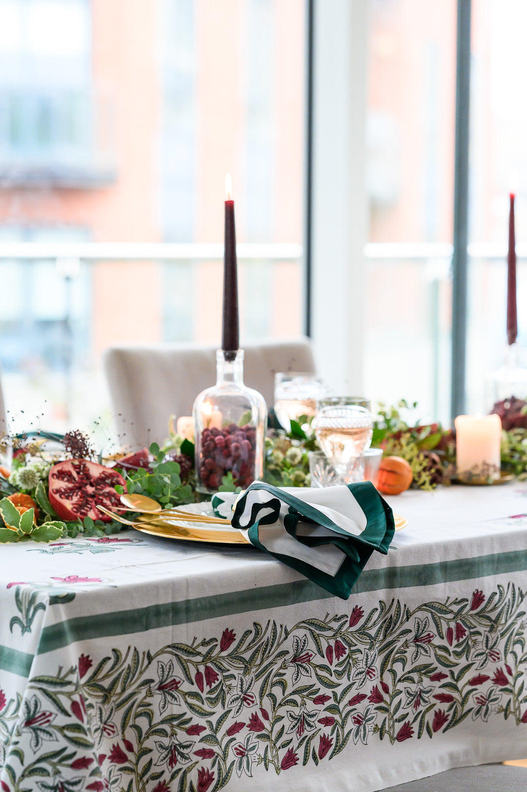 Bring festive elegance to your table with our Emerald Green Cotton Napkins. Hand screen printed by artisans in Jaipur, these crisp white napkins with a rich emerald border are the perfect finishing touch for your Christmas tablescape.