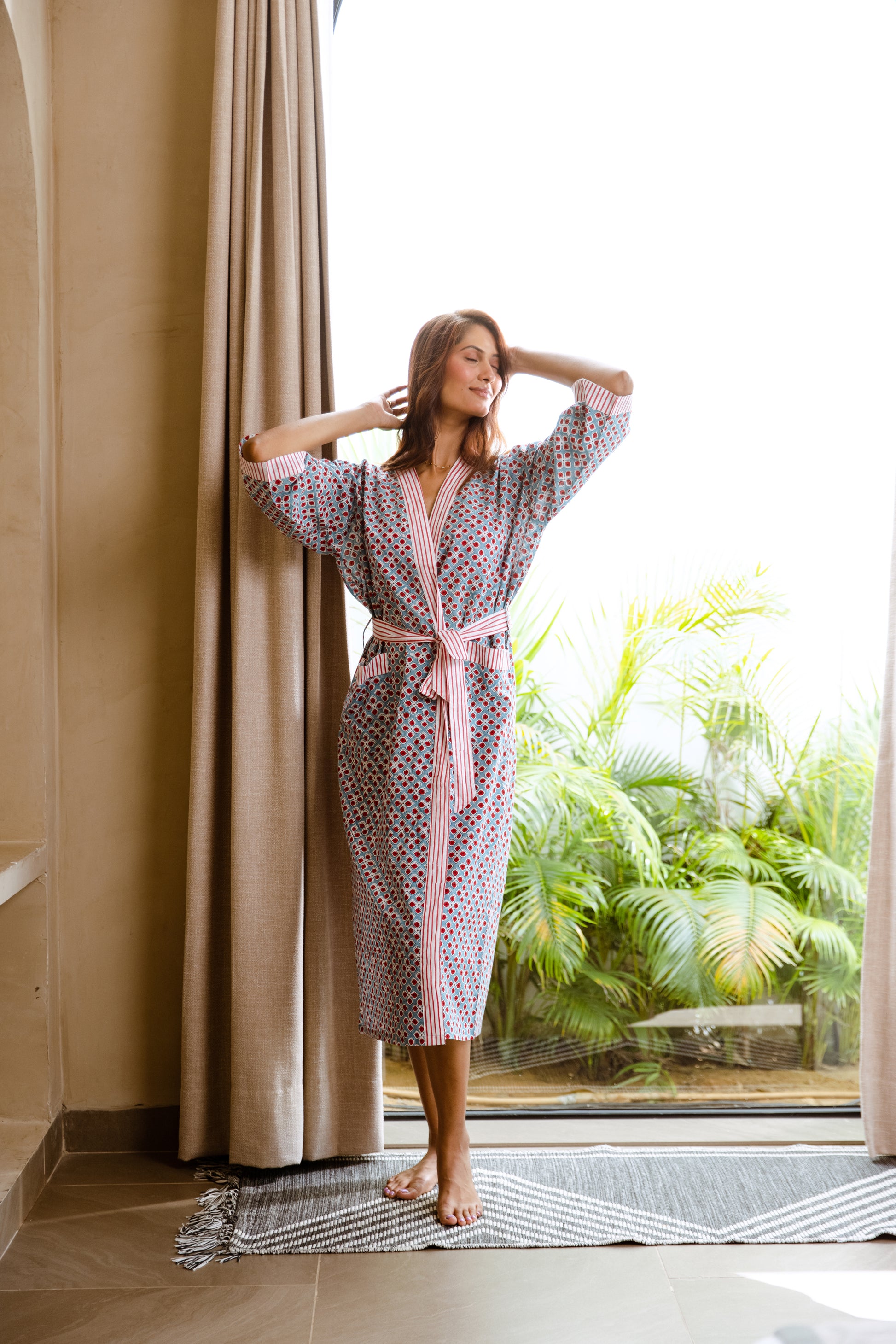 Wrap yourself in everyday comfort with our light cotton robe, handcrafted from 100% breathable Indian cotton. Each robe is hand block printed by artisans in Jaipur, making every piece truly unique. Lightweight, soft, and easy to wear, it’s designed for relaxed mornings, cosy evenings, and effortless layering through the seasons.