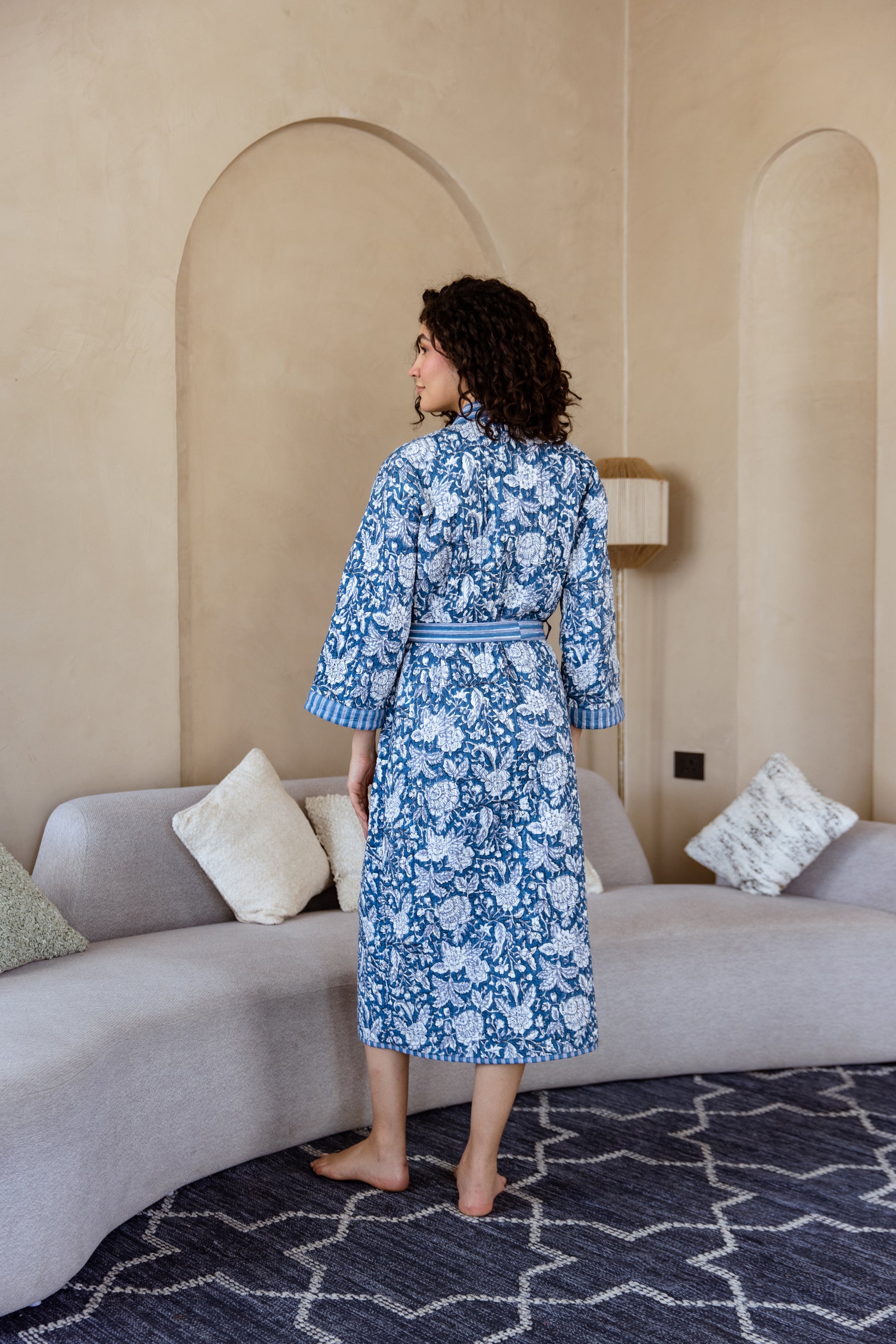 Featuring a delicate floral pattern in calming shades of blue and white, our Blue Floral Quilted Cotton Robe is hand block printed and finished with striped trims and a soft cotton lining. A beautiful blend of comfort and craftsmanship — the perfect layer for moments of quiet luxury.