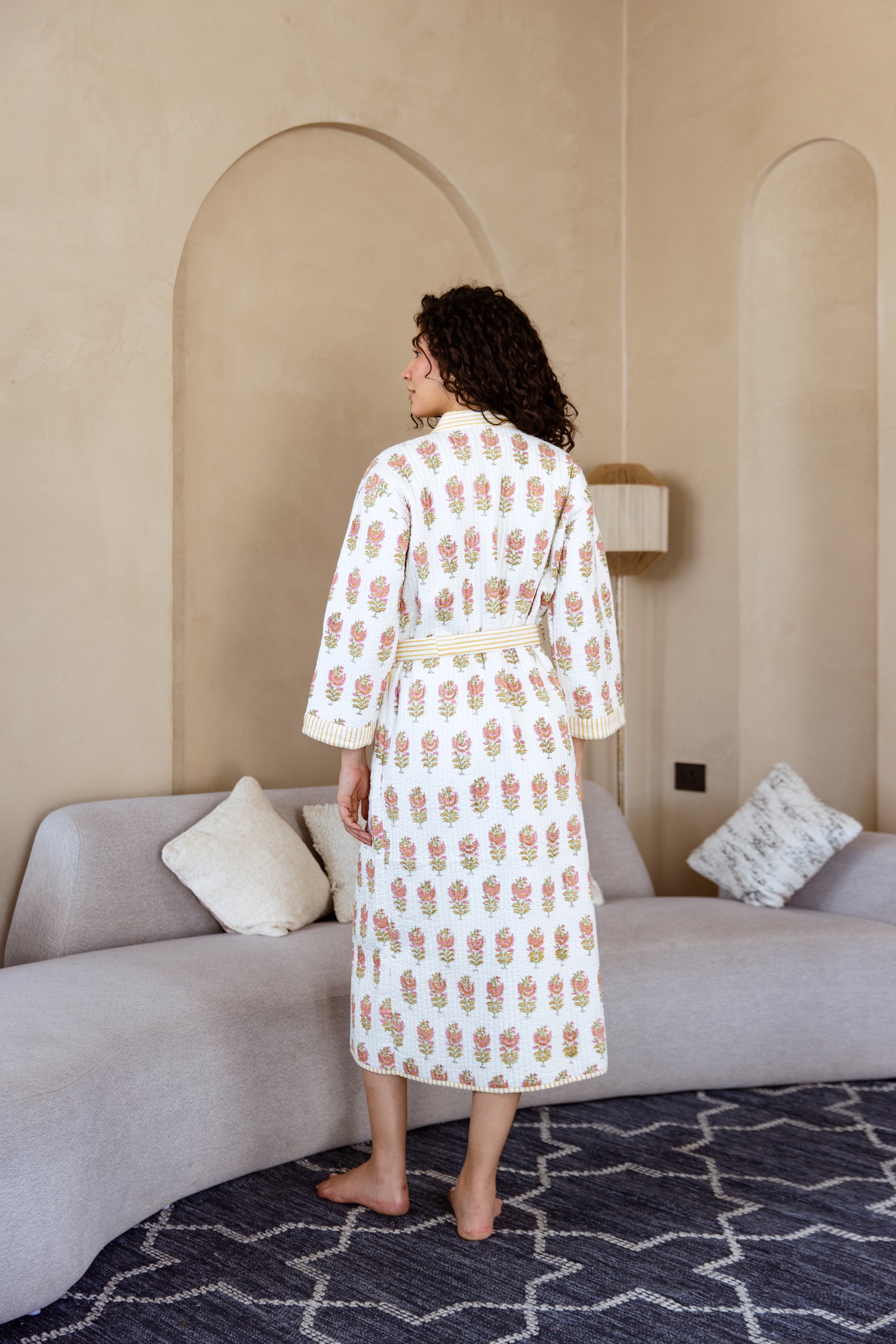 Sunshine in a robe — our Marigold Bloom Quilted Cotton Robe is hand block printed with joyful yellow and pink blooms on a crisp white base. Quilted in pure cotton and finished with yellow striped trims, it brings warmth and brightness to every day.