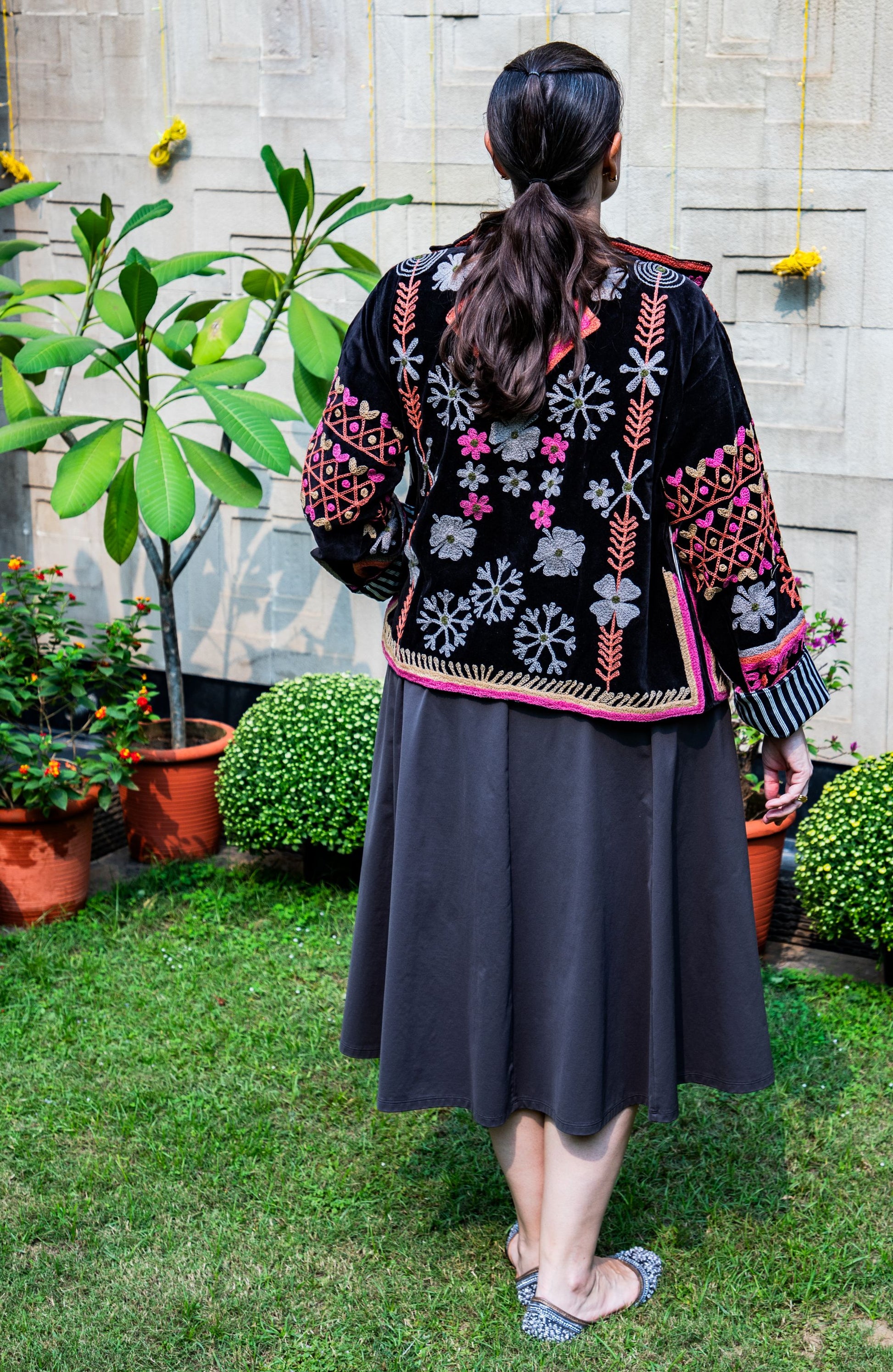 A show-stopping piece in any wardrobe, this Suzani Jacket blends timeless heritage with effortless modern wearability. Handcrafted using traditional Suzani needlework techniques, each jacket is adorned with intricate, colourful motifs that make every piece truly one-of-a-kind. Set on a base of plush velvet, it offers a beautiful sense of richness, depth, and an elevated, tactile finish.