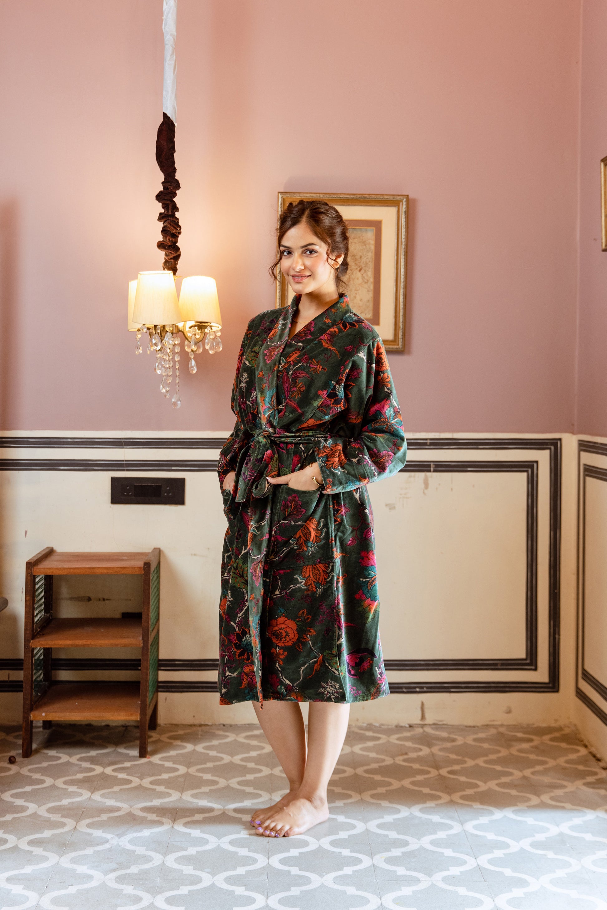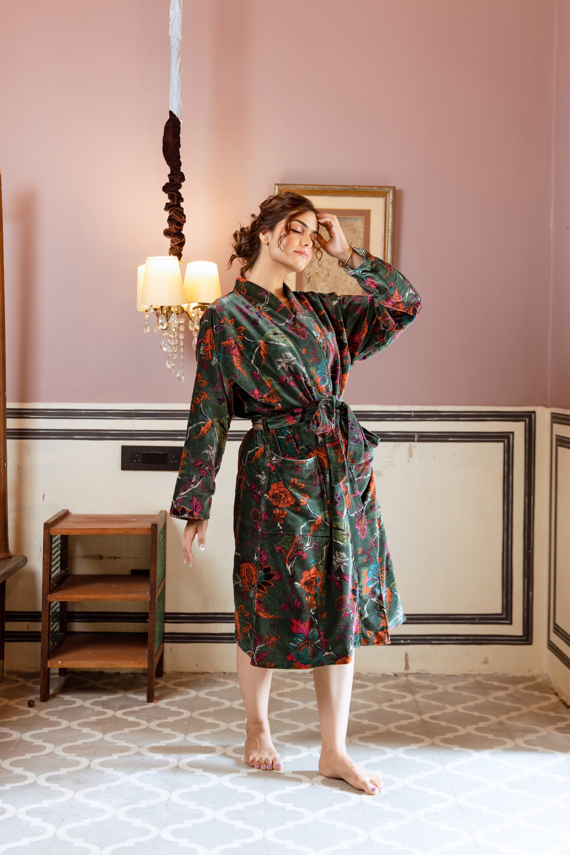 Our calf-length velvet kimono robe is made from the finest hand screen printed cotton velvet and lined with pure cotton. Soft, warm, and comfortable, it has a rich texture and easy drape that makes it perfect for wearing at home. Ideal for cosy mornings, relaxing nights in, or as a luxury gift, this robe is a timeless piece. A perfect Christmas gift or special occasion present, this velvet robe will be cherished for years to come.
